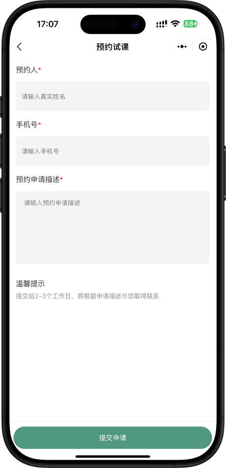 小程序首页与预约列表头部,支持模块化自定义配置,凸显品牌个性